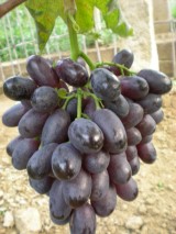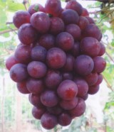 金田玫瑰 果穗圆锥形,果穗大小22.8x14.7厘米,果穗梗长3.60厘米,果穗中等紧密,穗640.6克,果粒圆形,平均大小2.39x2.11厘米。平均单穗重8.03克。果皮紫红色,着色一致,果粒中等厚,有浓郁玫瑰香味。含糖量20.2%。 |