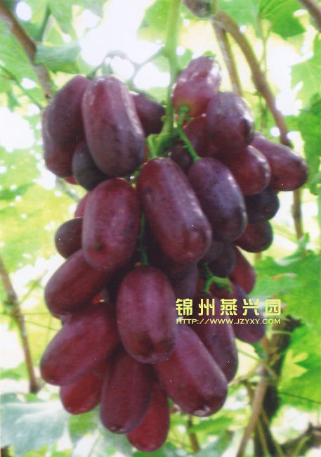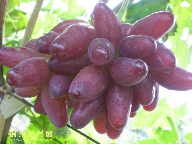 金田美指 金田美指是牛奶与美人指杂交的欧亚种,果穗圆锥形,穗重500g左右,果粒长椭圆形,果实皮色鲜红色,皮色一致,果粒着色整齐,果肉为白色,有香味,果肉脆,多汁,口感酸甜,9月下旬成熟,属于晚熟品种。 |