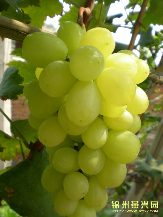 金田翡翠 果穗圆锥形,无歧肩,平均单穗重474g,果粒近圆形,果皮翠绿色一黄绿色,着色一致。果肉白色,有清香味。肉质脆,多汁,可溶性固形物含量21%,味甜。成熟期在9月中下旬,属于晚熟品种。 |